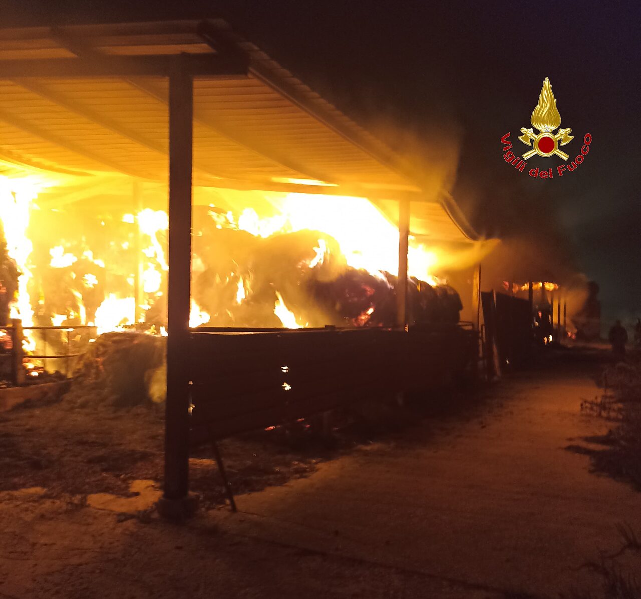Le fiamme hanno interessato circa quaranta rotoballe di fieno stipate all’interno di un capannone di circa 600 mq.