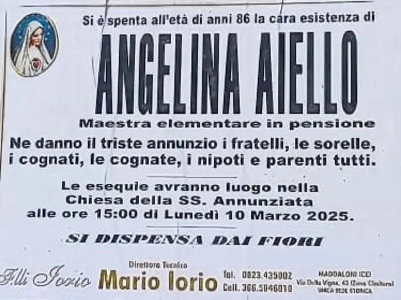 I funerali della maestra Angelina si sono svolti ieri alle ore 15:00 nella chiesa della SS. Annunziata a Maddaloni