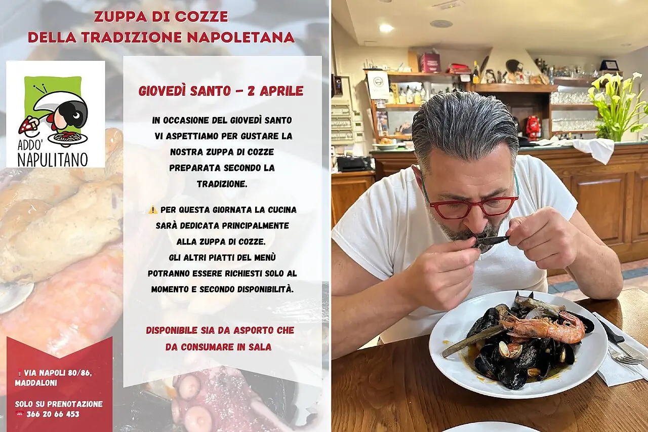 Un piatto tipico della tradizione pasquale campana calda e saporosa sarà disponibile nel locale di via Napoli a Maddaloni sia per la consumazione in sala che per asporto, ovviamente su prenotazione. Per questa giornata la cucina sarà dedicata principalmente alla zuppa di cozze. Gli altri piatti del menù potranno essere richiesti solo al momento e secondo disponibilità.