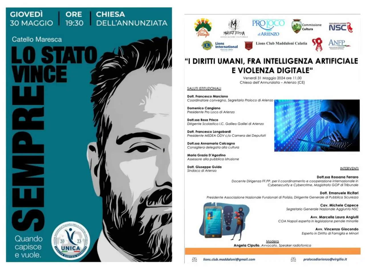 Sulla scia delle tematiche che coinvolgono maggiormente le nuove generazioni, seguirà, venerdì 31 maggio, il convegno dal titolo “I diritti umani, fra intelligenza artificiale e violenza digitale”, organizzato alle ore 11, nella storica Chiesa dell’Annunziata, con la collaborazione della Commissione Cultura, della Pro Loco di Arienzo, dell’Associazione Muratterra, del Lions Club Maddaloni Calatia, dell’ODV Medea, del Nuovo Sindacato Carabinieri e dell’Associazione Nazionale Funzionari di Polizia. Interverranno diversi esperti e, per l’Amministrazione Comunale, il Primo Cittadino, unitamente all’assessore alla Pubblica Istruzione Maria Grazia D’Agostino e alla consigliera delegata alla Cultura Anna Maria Calcagno