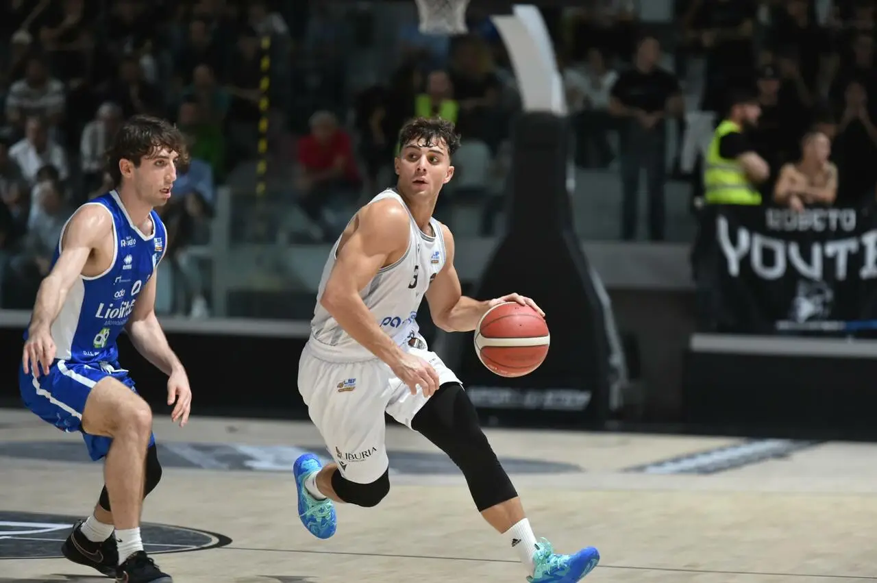Al rientro in campo, come accaduto ad inizio gara, la Liofilchem ha preso subito il largo ed ha raggiunto di nuovo la doppia cifra di vantaggio (38-50) con Tseteserukou. Il massimo divario (+13) è stato opera di Aukstikalnis, ma i bianconeri non hanno mollato e con Ricci dalla distanza hanno recuperato fino al -5 (51-56) che ha segnato anche il risultato del terzo periodo.