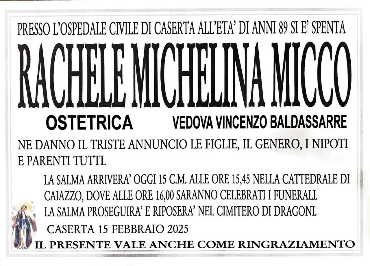 E’ venuta a mancare nelle scorse ore Rachele Michelina Micco di anni 89. La signora era molto nota tra Dragoni e Caiazzo per la sua attività di ostetrica. Era ricoverata all’ospedale “Sant’Anna e San Sebastiano” di Caserta dove è purtroppo deceduta.