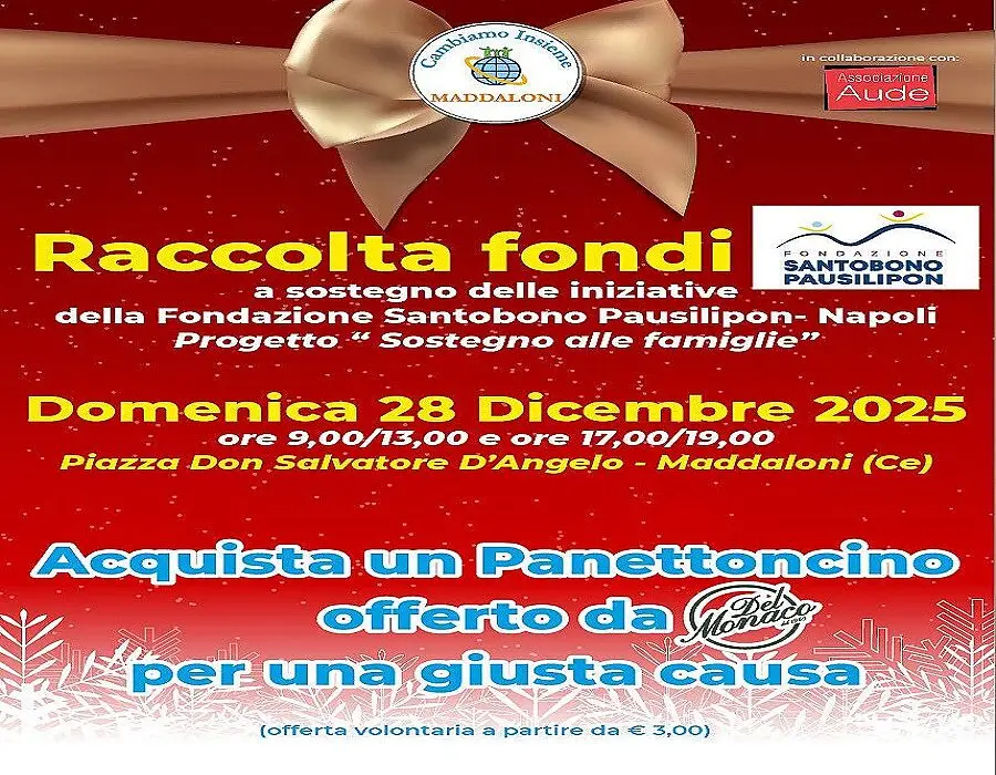 L’appuntamento è per domenica 28 dicembre in Piazza don Salvatore d’ Angelo dalle ore 09.00 alle 13.00 ci sarà il Gazebo della solidarietà . Sarà effettuata una vendita di panettoncini ( l’ offerta è libera a partire da un minimo di 3 euro ) gentilmente offerti e donati dal Bar Ristorante Del Monaco di Maddaloni . Il