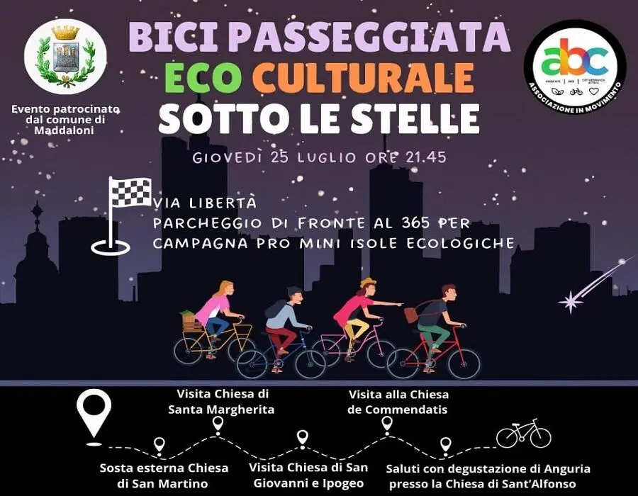 La partecipazione è gratuita e bisogna essere muniti di una propria bici. La partenza è prevista in via Libertà presso le Mini isole ecologiche, di fronte al supermercato 365. Si proseguirà con il tour delle chiese e ci si avvarrà della guida del prof. Antonio Tedesco che ci parlerà dei segreti delle chiese di San Martino, di Santa Maria de Commendatis, Santa Margherita, San Giovanni per concludere poi a Sant’Alfonso dove avrà luogo una degustazione di anguria al costo di 2 euro che serviranno, tra l'altro, a finanziare il Progetto "Libreria Sostenibile". Nel corso della passeggiata ci sarà anche un momento dedicato all’importanza dell’uso della bici.