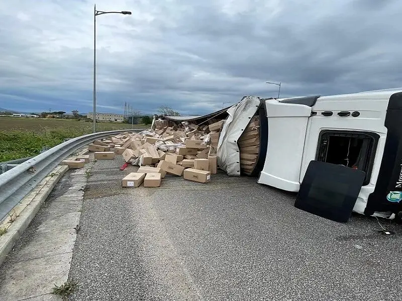 Il tutto è avvenuto all’altezza della rotonda che porta verso lo svincolo. Un tir per cause ancora del tutto da chiarire si è ribaltato. Il mezzo ha subito diversi danni e parte del carico è finito sull’asfalto. Probabilmente il tutto potrebbe essere legato all’alta velocità in curva e dalla presenza del vento forte.