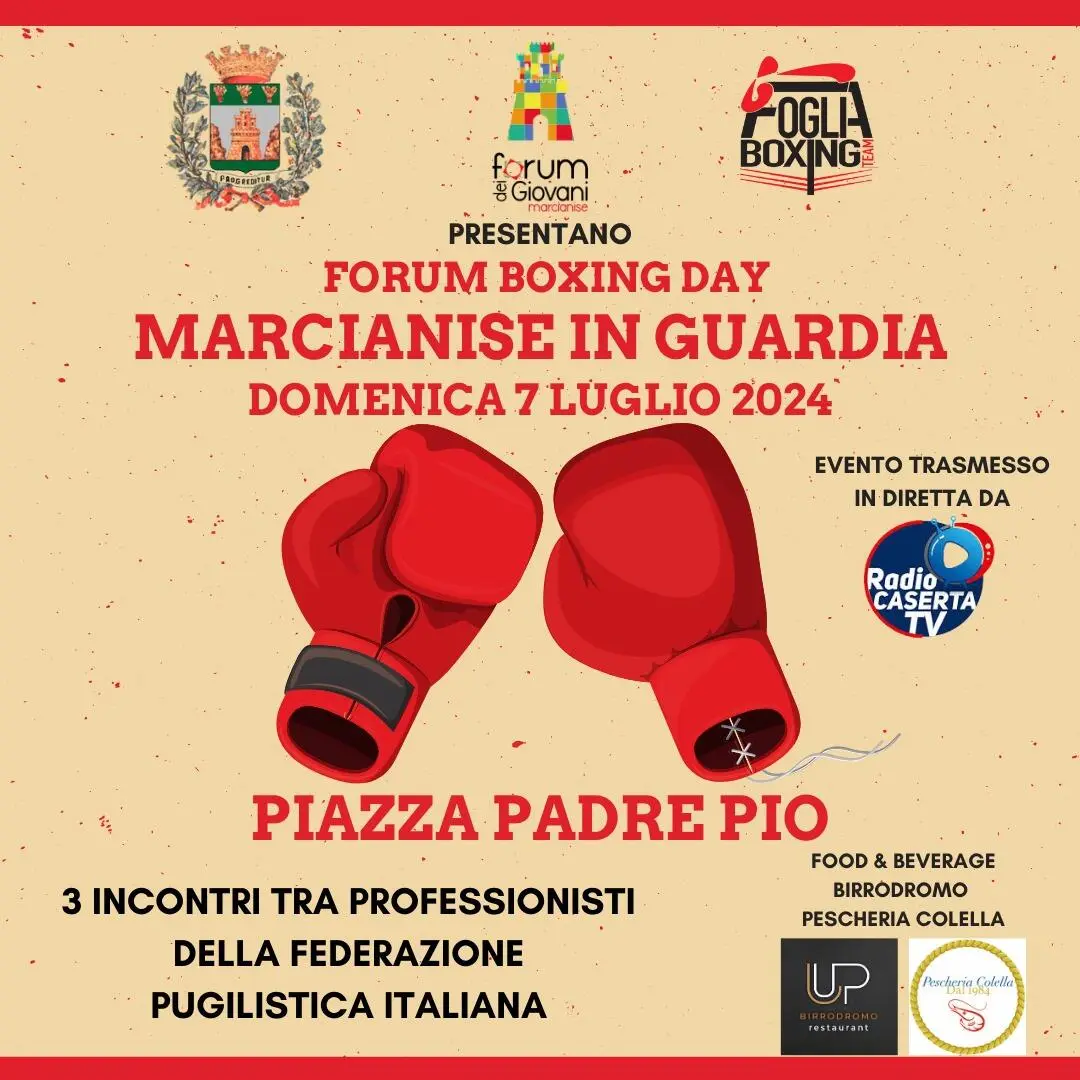 MARCIANISE - È prevista per domenica 7 luglio, a partire dalle 18.00, presso la Piazza Padre Pio, la manifestazione sportiva di boxe promossa dal Forum dei Giovani di Marcianise in collaborazione con l’Associazione Sportiva Dilettantistica Foglia Boxing Team.