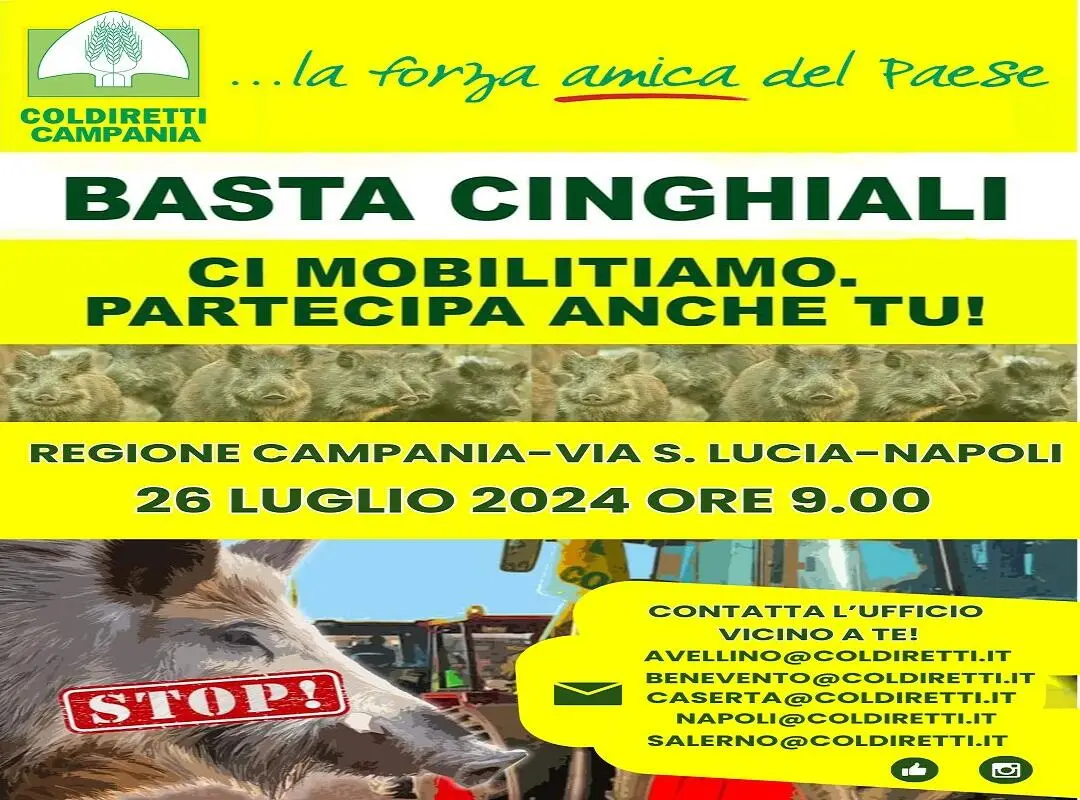 CASERTA – Coldiretti Campania si mobilita e scende in piazza per manifestare contro l'aumento incontrollato dei cinghiali sul territorio regionale. Dalle ore 9 di domani venerdì 26 luglio l'organizzazione, insieme ad agricoltori, allevatori, imprenditori agricoli e zootecnici, oltre a privati cittadini stanchi di questa emergenza effettuerà un sit-in a Napoli davanti alla sede della Regione Campania in via Santa Lucia. Raduno dei manifestanti provenienti da tutta la Campania, quindi anche dal Casertano, in piazza del Plebiscito per poi procedere alla volta di via Santa Lucia dove saranno illustrati i temi del giorno.