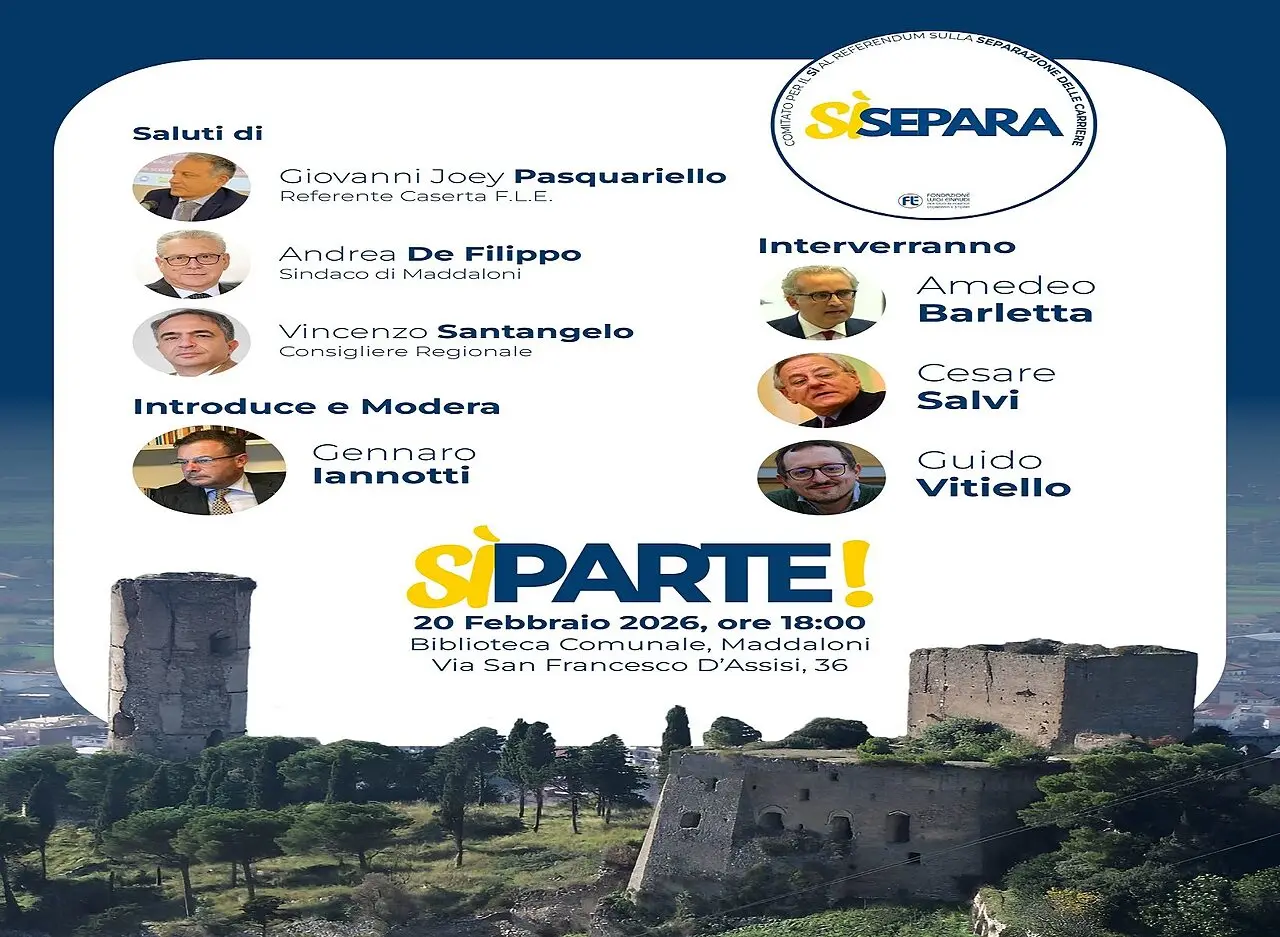 MADDALONI - Prosegue il ciclo di incontri pubblici in Terra di Lavoro del Comitato per il Sì al Referendum costituzionale sulla separazione delle carriere della magistratura, SìSepara, promosso dalla Fondazione Luigi Einaudi. Il prossimo appuntamento, dal titolo “SìParte!”, si terrà giovedì 20 febbraio 2026 alle 18.00 presso la Biblioteca Comunale di Maddaloni.