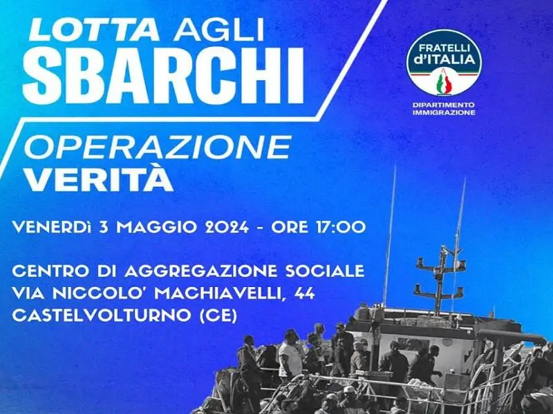 CASTEL VOLTURNO - 'Lotta agli sbarchi. Operazione verità': è questo il titolo del convegno, che si terrà venerdì 3 maggio, alle ore 17 presso il Centro di Aggregazione sociale di via Machiavelli a Castel Volturno.