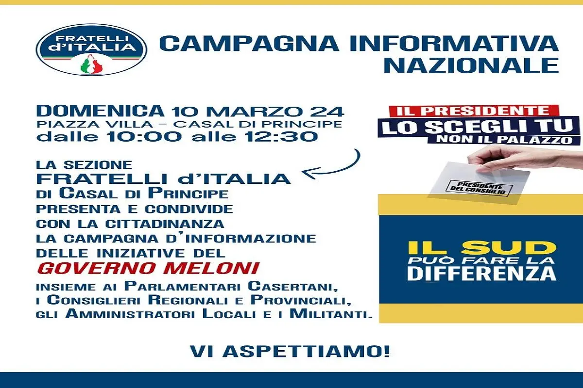 L'evento vedrà la presenza di un gazebo informativo, posizionato nel cuore di Casal di Principe, in Piazza Villa, domenica 10 marzo a partire dalle ore 10:00. L'iniziativa si propone come punto di incontro tra cittadini e rappresentanti di FdI, offrendo a tutti un'opportunità di dialogo diretto e approfondimento sulle proposte di riforma in discussione.