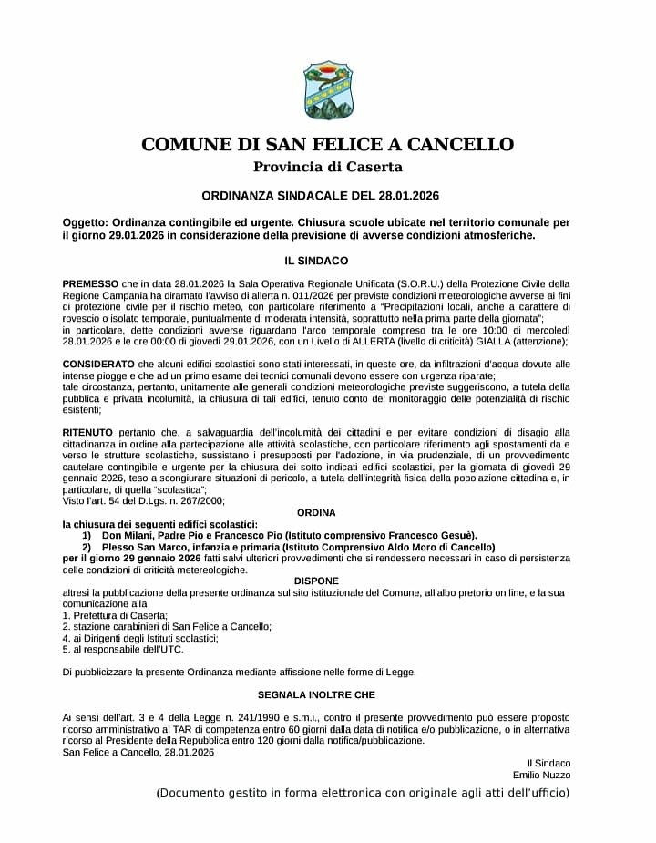 SAN FELICE A CANCELLO. È con un certo senso di responsabilità e preoccupazione che il sindaco Emilio Nuzzo ha deciso di chiudere per la giornata di domani, 29 Gennaio 2026, i plessi “Francesco Pio” della scuola dell’infanzia, “Padre Pio” e “Don Milani” della scuola primaria dell'Istituto comprensivo Francesco Gesuè e plesso San Marco infanzia e primaria dell'Istituto comprensivo statale Aldo Moro.
