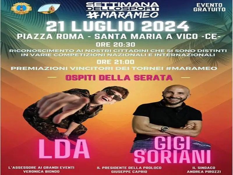 SANTA MARIA A VICO - Domenica 21 luglio si conclude in grande la Settimana dello Sport 2024! In Piazza Roma a Santa Maria a Vico, alle ore 20:30, avverrà la consegna di un riconoscimento ai cittadini che si sono distinti in varie competizioni nazionali e internazionali. Alle ore 21:00, si terrà la premiazione dei vincitori dei tornei marameo.