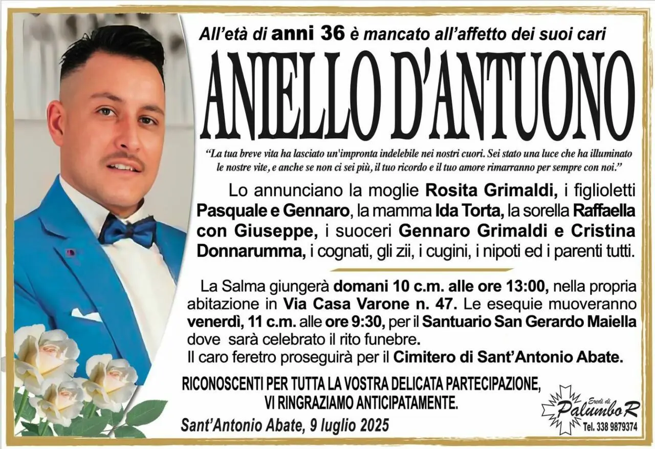 REGIONALE (Lucia Sforza). Un dolore improvviso e lacerante ha colpito la comunità di Sant’Antonio Abate per la tragica scomparsa di Aniello D’Antuono, giovane padre di soli 36 anni, venuto a mancare all’affetto della moglie, dei figli e dei tanti che gli volevano bene.