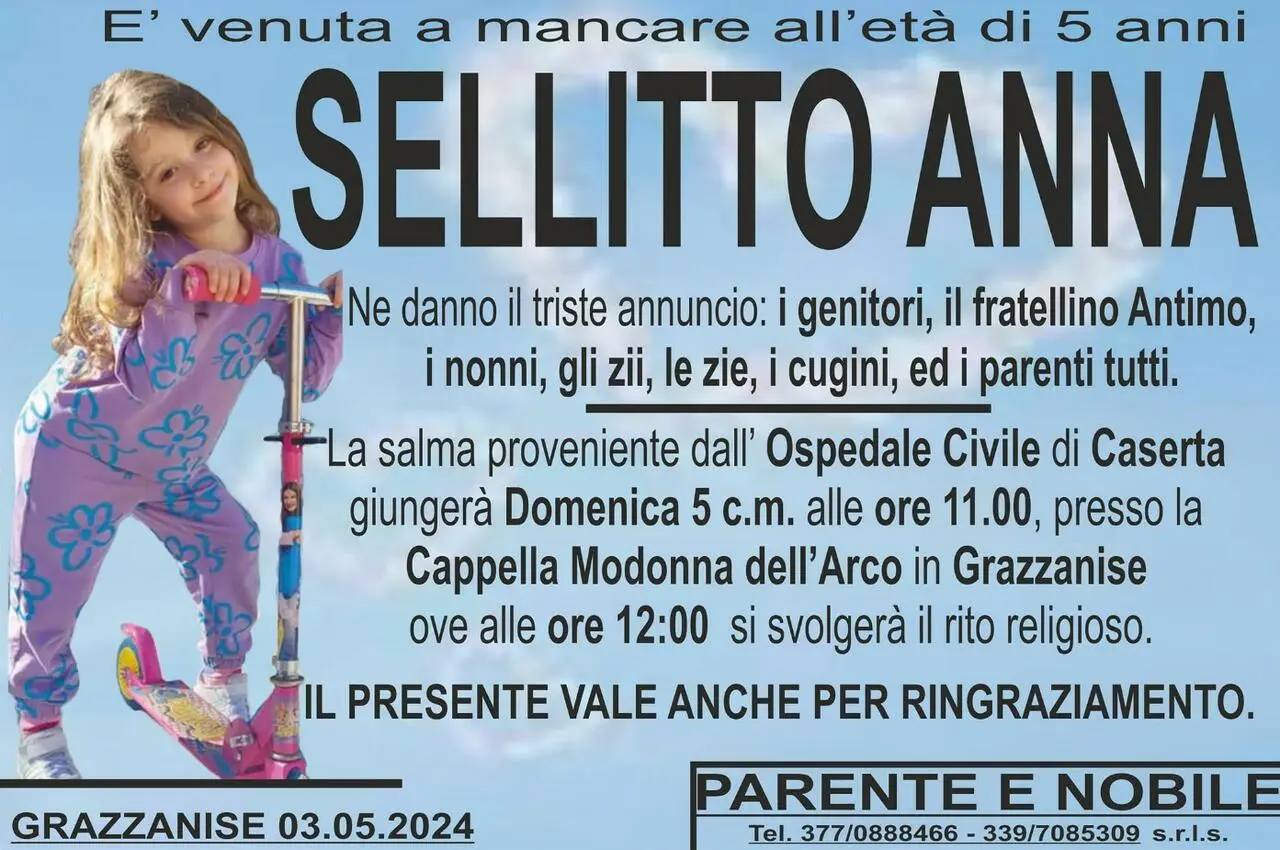 GRAZZANISE – Non si fermano i messaggi di cordoglio della comunità di Grazzanise per la morte della piccola Anna Sellitto, la bimba di 5 anni morta il 1 maggio dopo una cena in un ristorante con i genitori.