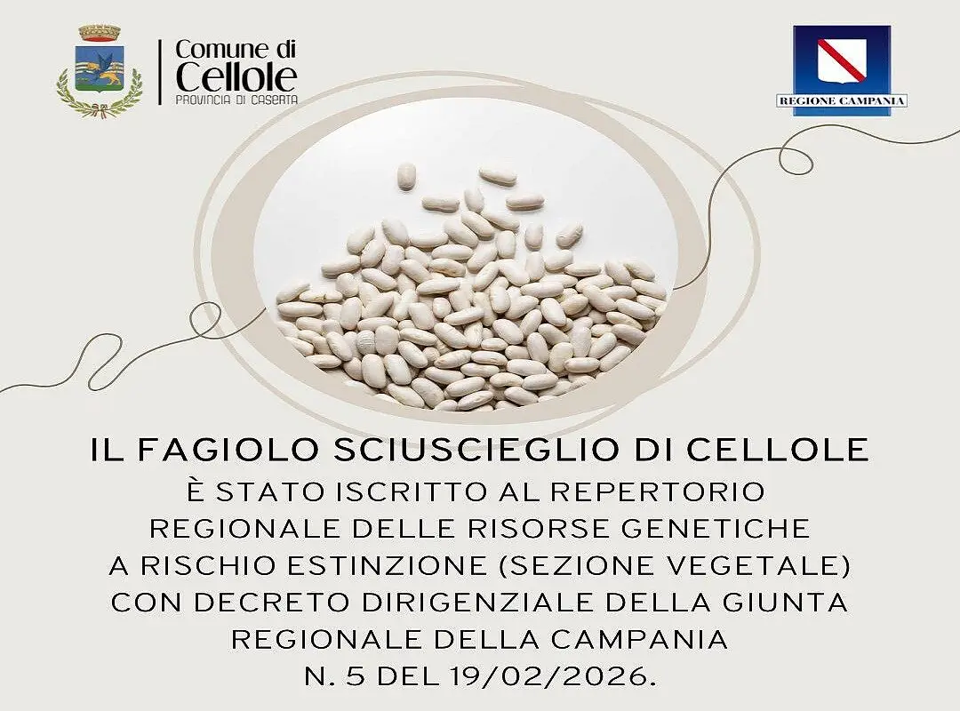 Il Comune di Cellole ed in particolare il Sindaco dott. Guido Di Leone e l’Assessore delegato all’Agricoltura dott.ssa Antonietta Marchegiano annunciano con orgoglio che il fagiolo Sciuscieglio di Cellole è stato iscritto al Repertorio regionale delle Risorse Genetiche a rischio estinzione (sezione vegetale) con Decreto Dirigenziale della Giunta Regionale della Campania n. 5 del 19/02/2026.