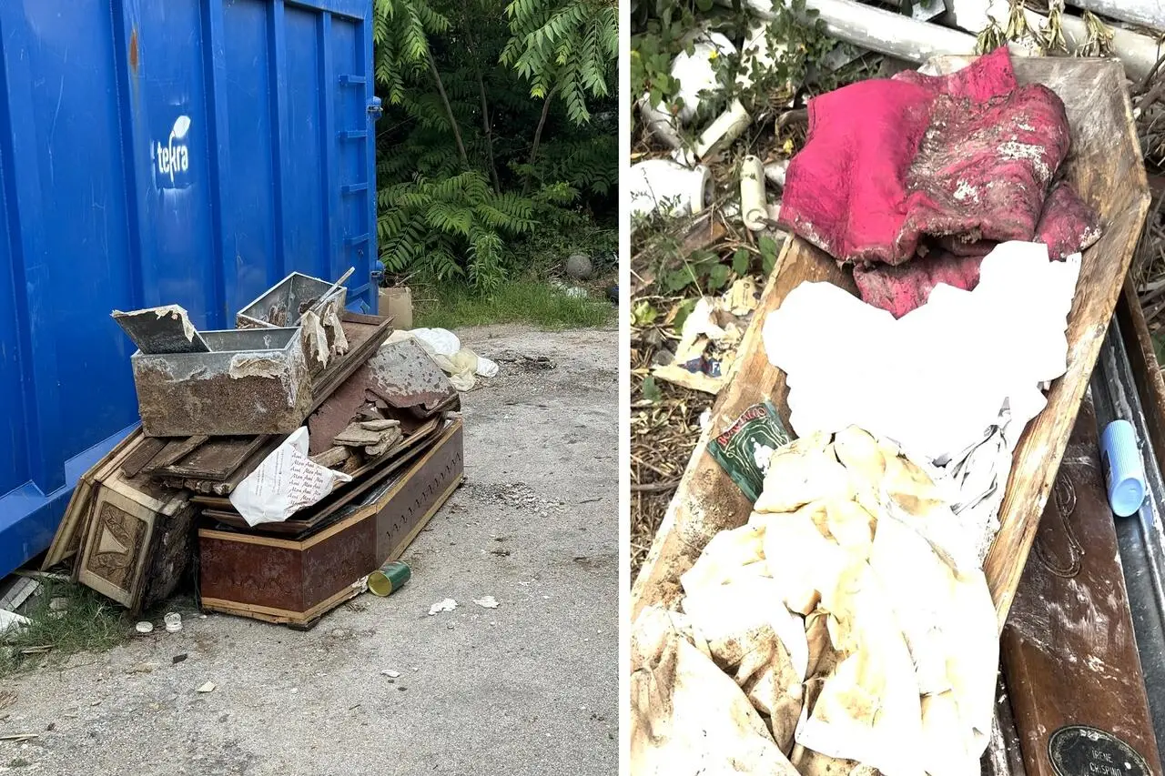 Squallore al cimitero, bare e cassette abbandonate davanti al cassone