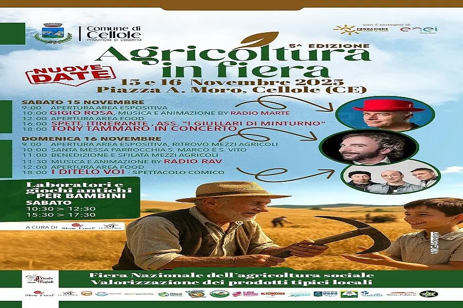 CELLOLE - Il Comune di Cellole è lieto di annunciare la quinta edizione di "Agricoltura in Fiera", l'evento annuale dedicato all'agricoltura, all'allevamento e alla tradizione locale, che si terrà il 15 e 16 novembre 2025 in Piazza A. Moro a Cellole (CE).