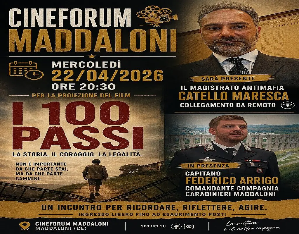In sala per incontrare i giovani sempre più numerosi che stanno partecipando a questi appuntamenti con il cinema, erano presenti: il magistrato Catello Maresca, celebre per il suo ruolo di primo piano nella lotta alla camorra come Sostituto Procuratore presso la Direzione Distrettuale Antimafia (DDA) di Napoli, e conosciuto principalmente per aver coordinato le indagini che hanno portato all'arresto del boss dei Casalesi, Michele Zagaria, nel 2011, che sarà presente in videoconferenza; il capitano Federico Arrigo, Comandante della Compagnia Carabinieri di Maddaloni che siederà in sala.