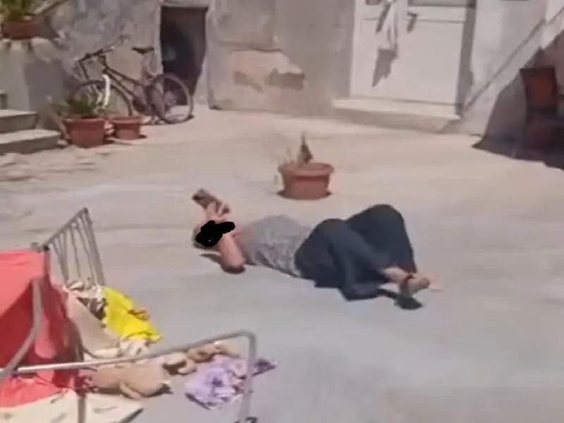 La donna ripresa in una delle mani stringe una forbice. Fin qui tutto farebbe presagire una minaccia evidente, ma poi all’improvviso, forse perché vistasi ripresa, la signora in questione si getta in terra simulando un’aggressione.