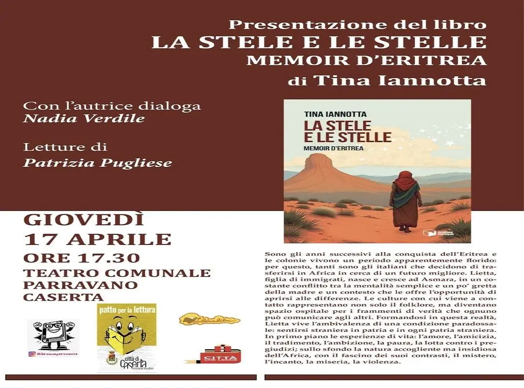 CASERTA - Un viaggio letterario tra le memorie dell’Africa e l’identità in bilico di una giovane donna: giovedì 17 aprile alle ore 17.30, presso il Foyer superiore del Teatro Comunale “Costantino Parravano” di Caserta, in via Mazzini 71, sarà protagonista l’opera “La stele e le stelle” di Tina Iannotta, edita da Scatole Parlanti.