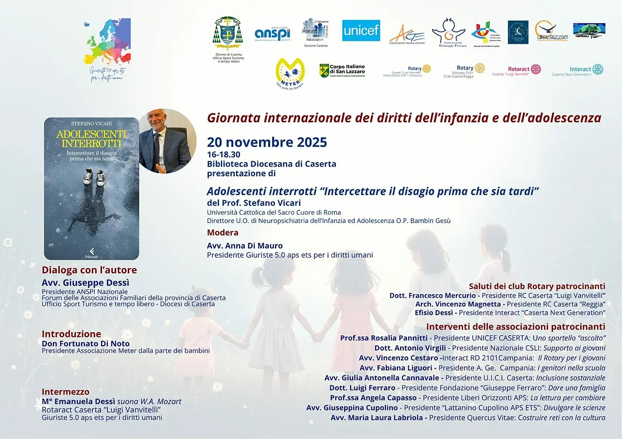 I saluti dei Rotary Club patrocinanti saranno portati dal dott. Francesco Mercurio (Presidente RC Caserta “Luigi Vanvitelli”), dall’arch. Vincenzo Magnetta (presidente RC Caserta “Reggia”) e da Efisio Dessì (Presidente Interact “Caserta Next Generation”). Seguiranno gli interventi delle associazioni patrocinanti: prof.ssa Rosalia Pannitti (presidente UNICEF Caserta – Uno sportello “ascolto”), dott. Antonio Virgili (presidente Nazionale CSLI – Supporto ai giovani), avv. Vincenzo Cestaro (Interact RD 2101 Campania – Il Rotary per i giovani), avv. Fabiana Liguori (presidente A.Ge. Campania – I genitori nella scuola), avv. Giulia Antonella Cannavale (Presidente UICI Caserta – Inclusione sostanziale), dott. Luigi Ferraro (presidente Fondazione “Giuseppe Ferraro” – Dare una famiglia), prof.ssa Angela Capasso (presidente Liberi Orizzonti APS – La lettura per cambiare), avv. Giuseppina Cupolino (presidente “Lattanino Cupolino APS ETS” – Divulgare le scienze per il sociale) ed avv. Maria Laura Labriola (presidente “Quercus Vitae” – Costruire reti con la cultura).