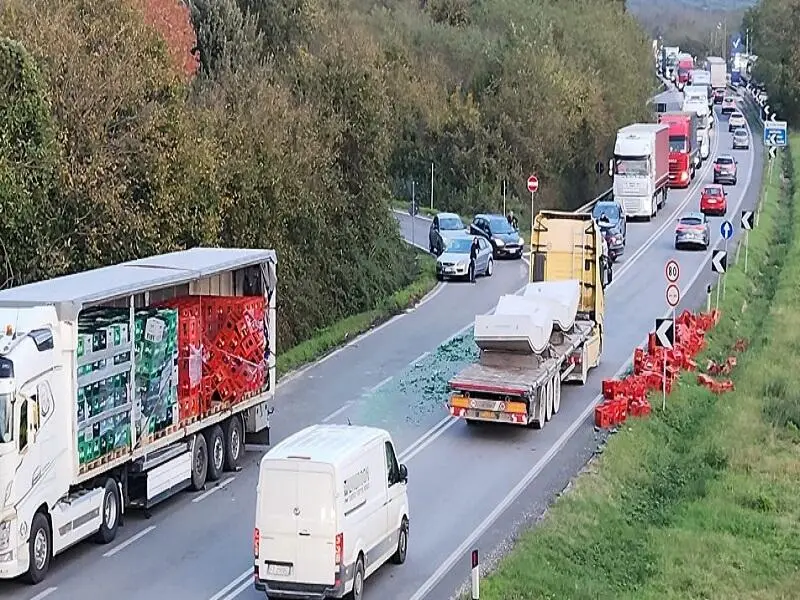 Casse di bottiglie d'acqua sulla carreggiata: disagi al traffico
