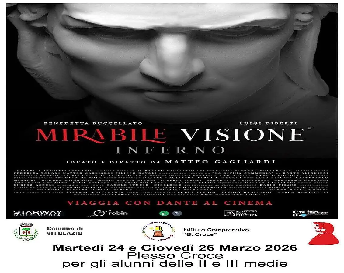 VITULAZIO - C’è un viaggio che attraversa i secoli e continua a interrogare l’uomo contemporaneo, un itinerario interiore che dalla parola poetica si fa visione, immagine, racconto vivo: è l’Inferno di Dante Alighieri, che a Vitulazio torna a parlare alle nuove generazioni attraverso il linguaggio potente del cinema. In occasione del #Dantedì, il Comune di Vitulazio promuove la proiezione del docu-film “Mirabile Visione: Inferno”, ideato e diretto da Matteo Gagliardi, in collaborazione con l’Istituto Comprensivo “Benedetto Croce”.