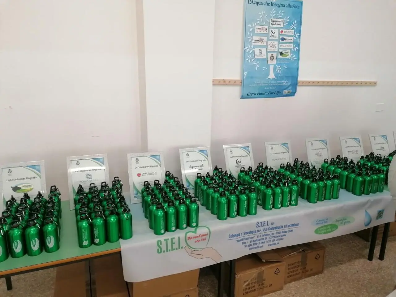 La società S.T.E.I. aveva richiesto il patrocinio del Comune di Vitulazio per il Piano educativo di Intervento a favore delle scuole denominato “L’ACQUA CHE INSEGNA ALLA SETE”, volto a rendere fruibile agli studenti del territorio un’acqua di qualità in ambiente sanificato, mediante l’installazione di dispositivi di grande sostenibilità e compatibilità ambientale. L’acqua distribuita è controllata, micro filtrata, fresca e batteriologicamente pura. Donate anche delle borracce in alluminio, che gli studenti potranno riempire gratuitamente ogni giorno negli appositi dispositivi.