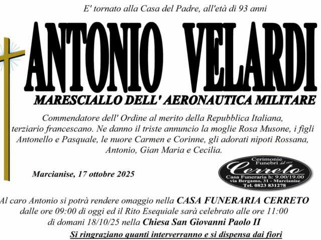 “Buongiorno a tutti, permettetemi di rivolgere le più sentite condoglianze alla famiglia Velardi ed all'ex Sindaco di Marcianise Antonello, in modo particolare, per la scomparsa del caro Antonio, papà del giornalista e aviere dalla brillante carriera militare arricchita con numerose onoreficenze. Una persona estremamente perbene innamorato della nostra città. R.I.P.” - dichiara il deputato regionale marcianisano.
