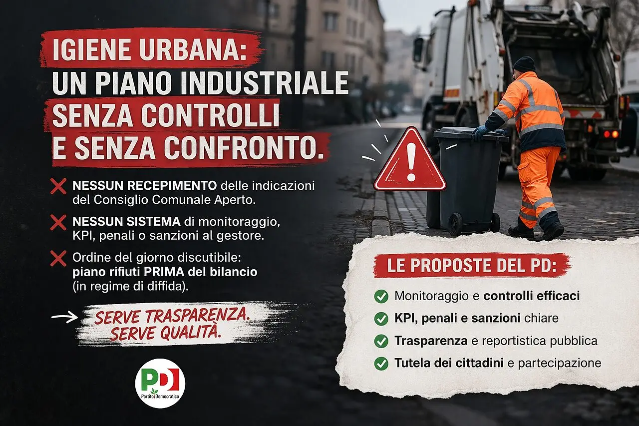 “Il Partito Democratico esprime forte preoccupazione e netta contrarietà rispetto al piano industriale per il servizio di igiene urbana così come impostato dall’Amministrazione. Nel merito, il provvedimento evidenzia gravi carenze strutturali; infatti, non si rinviene alcun riferimento a elementi fondamentali per garantire un servizio efficiente, trasparente e realmente controllabile. In particolare, risultano del tutto assenti: