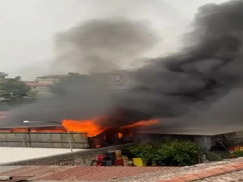 Incendio in un deposito, nube nera nel cielo dell'agro