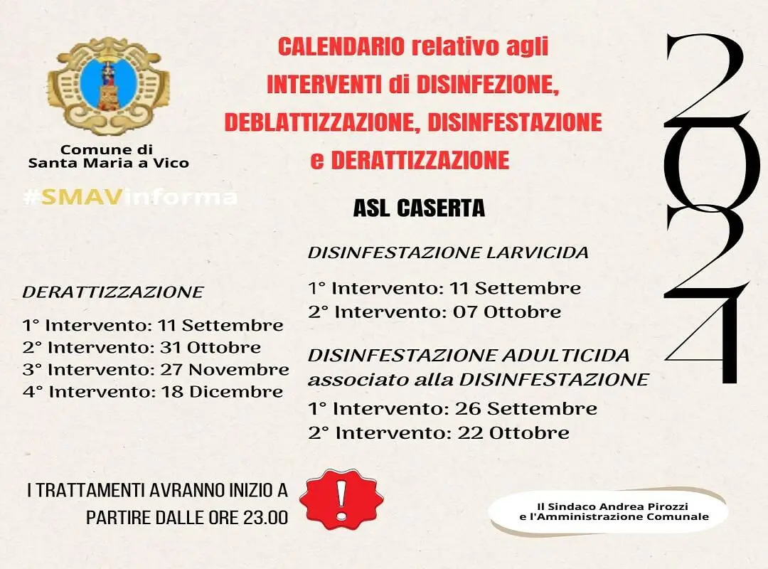 "Informiamo tutti i cittadini sulla programmazione degli interventi di disinfestazione, derattizzazione e deblattizzazione effettuata dall'ASL Caserta sul nostro territorio.