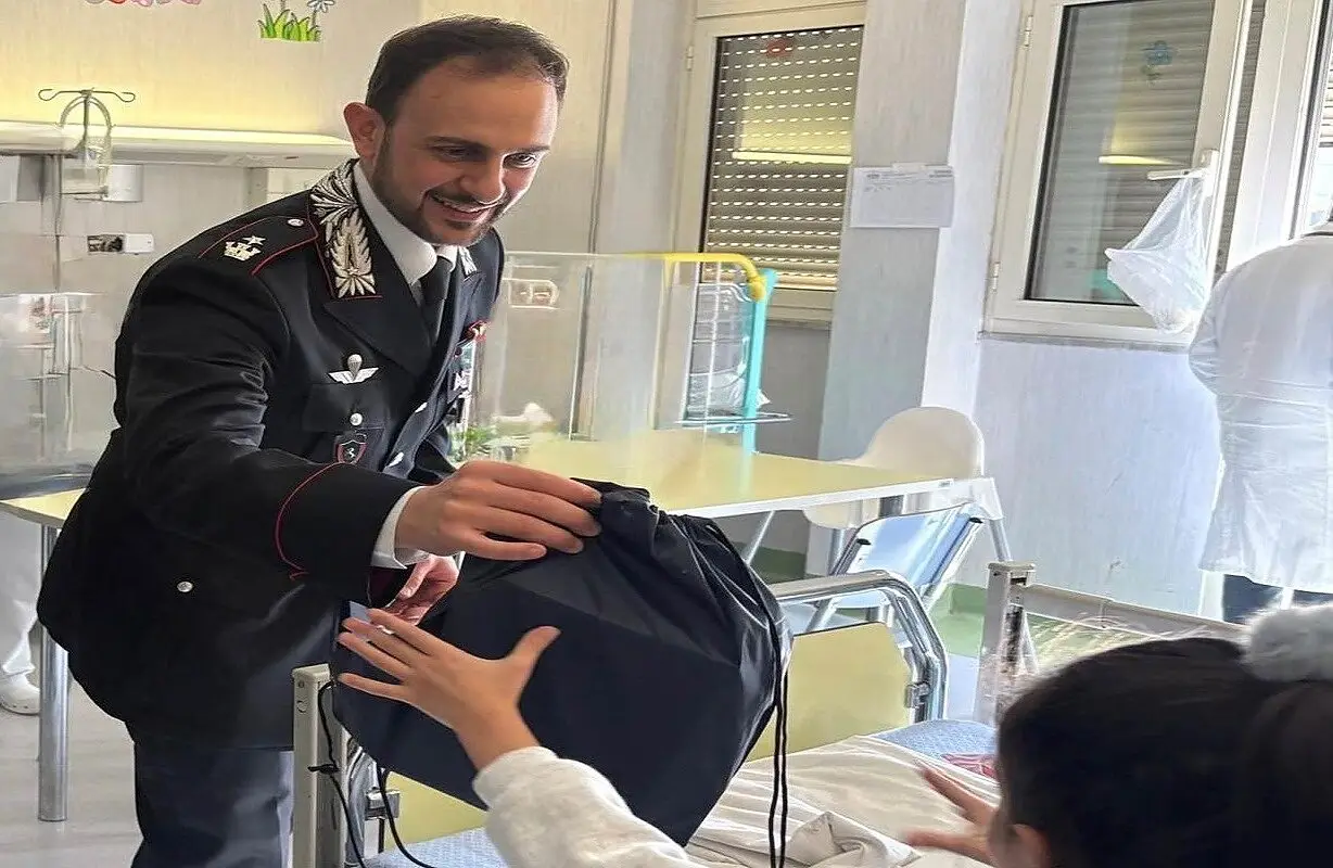 Al loro risveglio, ad accoglierli non sono stati soltanto i medici e gli infermieri che ogni giorno si prendono cura della loro salute, ma una visita del tutto speciale: i Carabinieri della Compagnia di Caserta, guidati dal Comandante, Maggiore Giovanni RIACÀ. Con discrezione e grande sensibilità, i militari hanno attraversato le stanze del reparto portando doni pensati per i più piccoli: giocattoli, libri, zainetti, cappellini e gadget che hanno immediatamente acceso la curiosità e l’entusiasmo dei bambini.