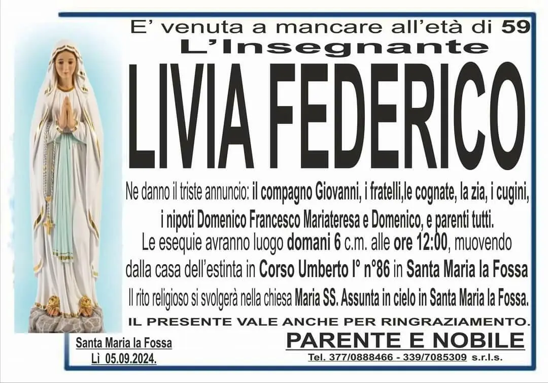 Livia Federico lascia il compagno Giovanni, i fratelli e i nipoti Domenico, Francesco e Maria Teresa. L’ultimo saluto all’insegnante si svolgerà domani alle ore 12 nella chiesa della SS. Assunta in Cielo di Santa Maria la Fossa.
