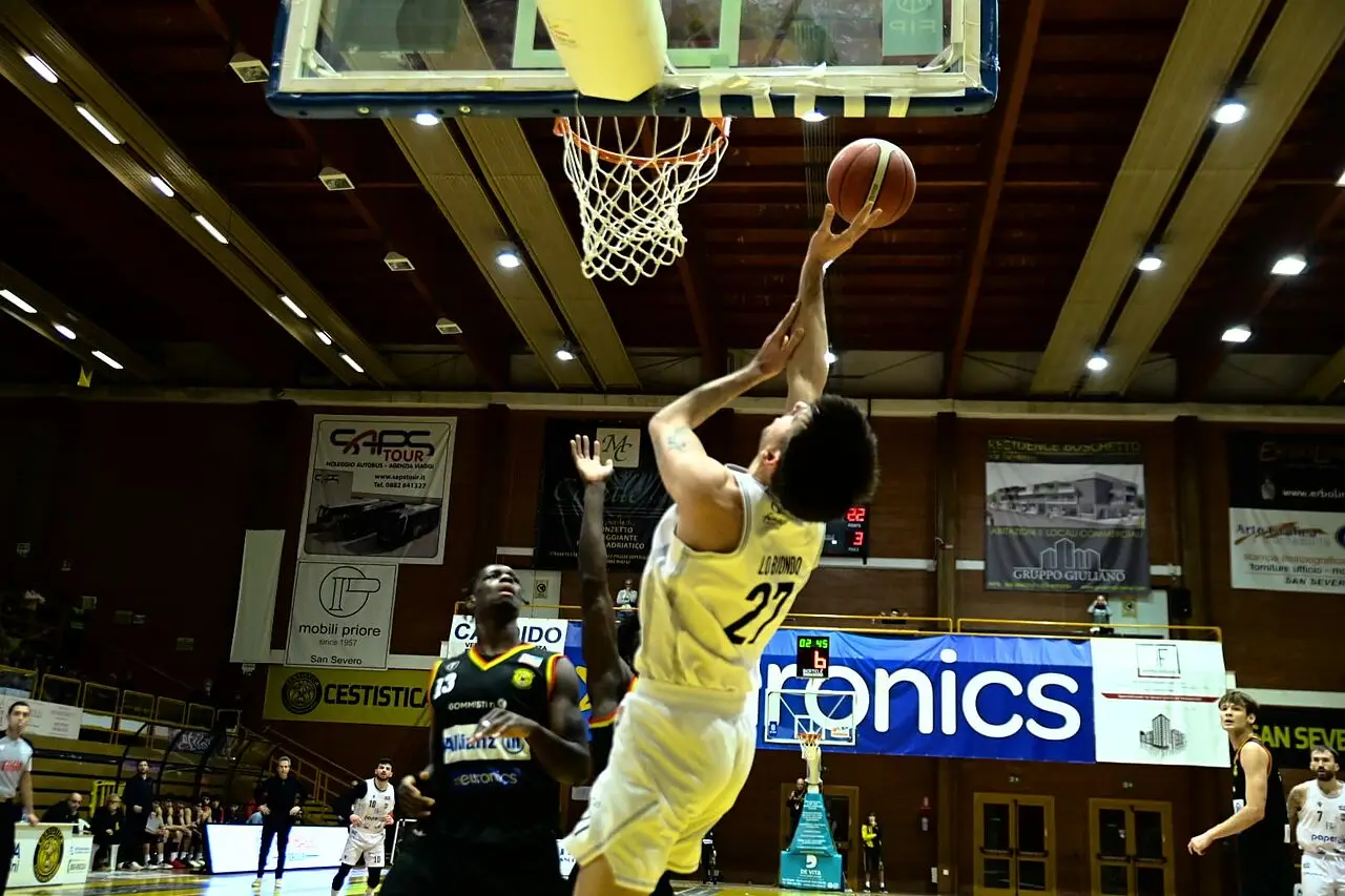 Ultimo periodo in cui la Paperdi è stata brava a sfruttare la precisione dalla distanza di Damir Hadzic e le percussioni di D’Argenzio per tenere a distanza i padroni di casa che con un canestro di Vecerina hanno raggiunto il +9 (66-75) dopo 4’49”. San Severo ha prodotto l’ultimo sforzo e, grazie alle iniziative dell’ex Lucas ed alla tripla di Mobio, è riuscita a riaprire la contesa, portandosi sul -2 con un 7-0 di parziale (73-75). È stato Brambilla a chiudere dall’angolo una precisa azione offensiva dei bianconeri; poi, Hadzic da 3 e D’Argenzio dalla linea della carità nell’ultimo giro di lancette hanno dato il +8 ai bianconeri, che poi con Hadzic dalla lunetta hanno chiuso definitivamente il confronto.
