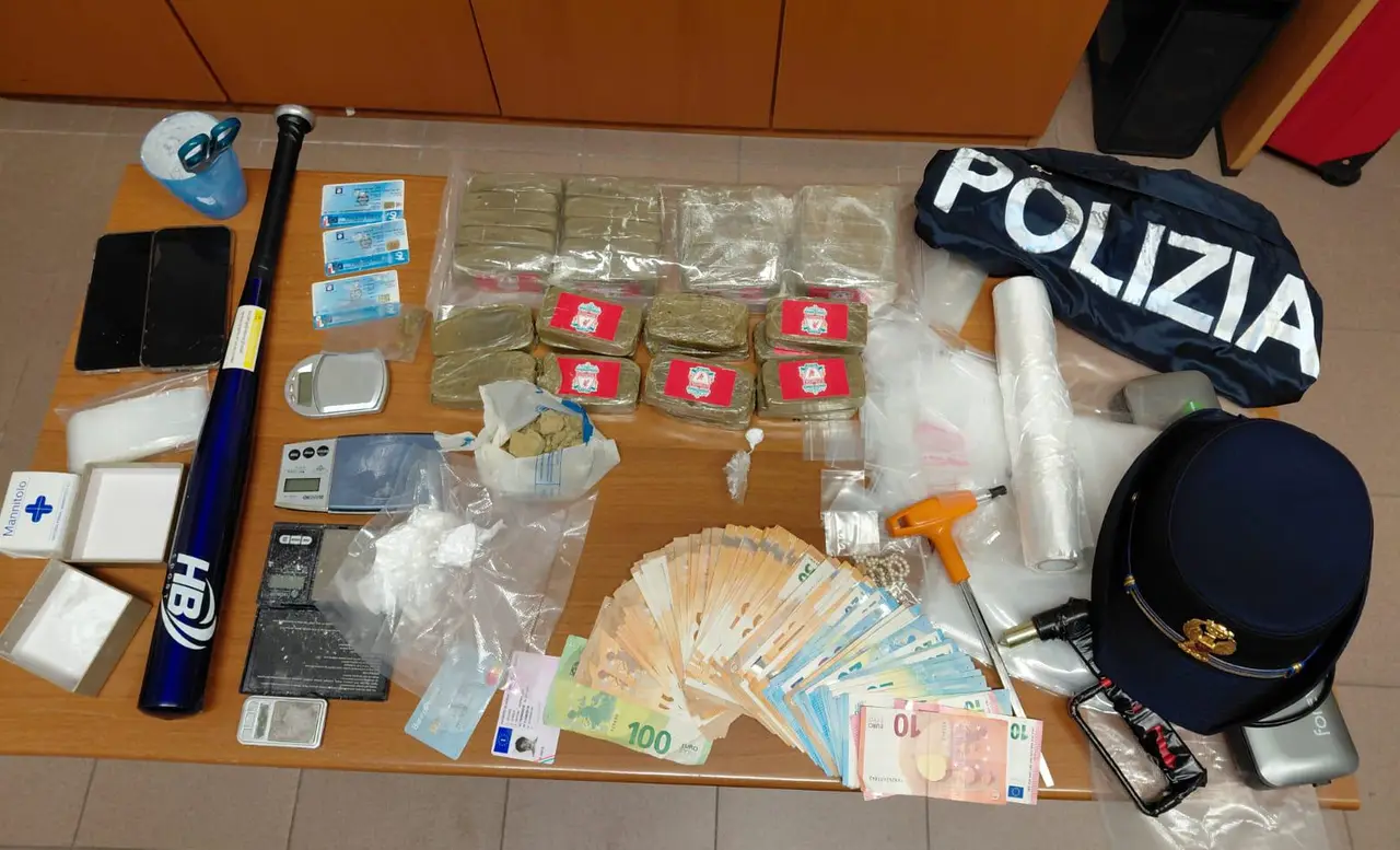 Durante la perquisizione personale e del veicolo, venivano rinvenuti un involucro contenente gr. 14,8 di cocaina, la somma di euro 4.450,00, suddivisa in banconote di vario taglio ed una mazza da baseball all’interno dell’auto. Dai controlli, estesi anche all’abitazione ed alle pertinenze della stessa, i poliziotti trovavano trentatré (33) panetti di hashish, per il peso lordo di 3167 grammi, 51,51 grammi di cocaina, 1,29 grammi di marjiuana, tre bilancini di precisione, intrisi di sostanza bianca polverosa, nonché materiale utile per il confezionamento delle dosi.