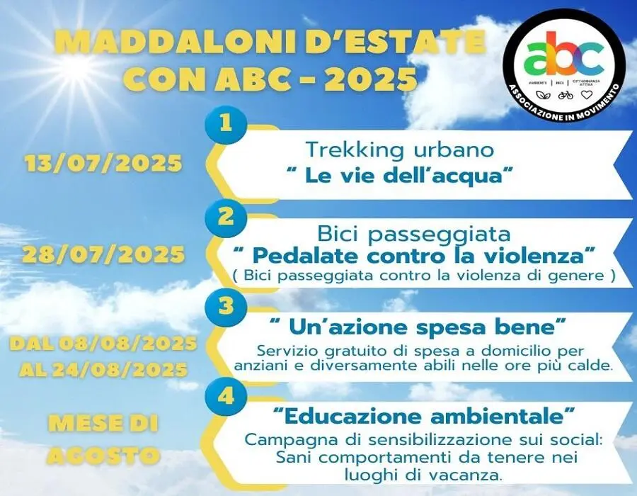 MADDALONI – L’associazione “abc” di Maddaloni non si ferma in estate, anzi rilancia con un ricco calendario di eventi estivi, quattro iniziative che puntano a toccare non solo differenti tematiche, ma anche molteplici sensibilità e passioni.