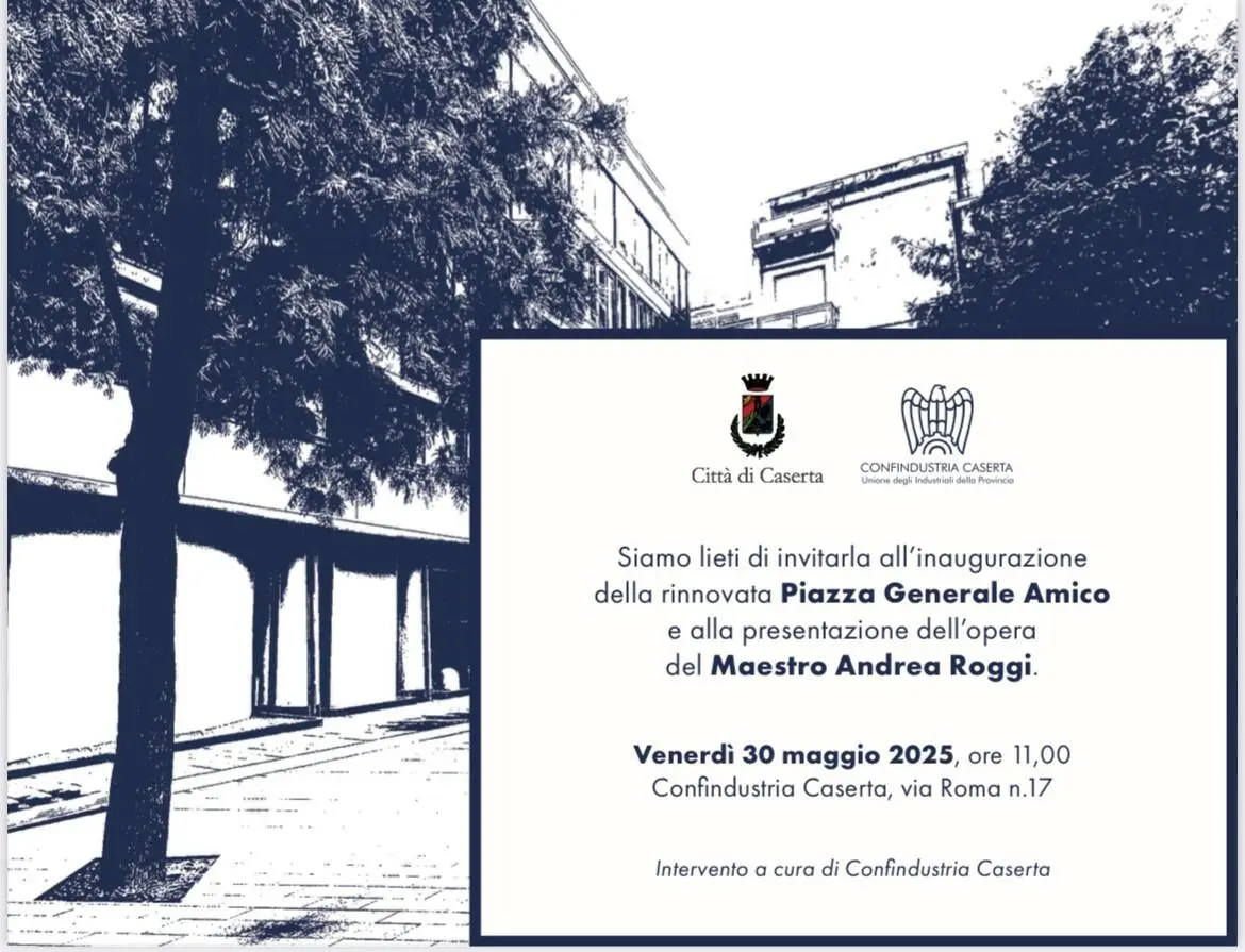 Questa opera di riqualificazione, arricchita dall’installazione di un’opera d’arte, rappresenta un esempio virtuoso di collaborazione tra pubblico e privato nonché un messaggio importante, secondo cui la cultura può essere un elemento di riscatto e crescita per la città”. L’evento inaugurale si terrà venerdì 30 maggio alle ore 11.00. Il programma prevede l’inizio dell’evento presso la sede di Confindustria Caserta, in via Roma 17, e a seguire il taglio del nastro in Piazza Generale Amico, con la partecipazione delle autorità civili e militari, della classe imprenditoriale casertana, dell’artista e della cittadinanza.
