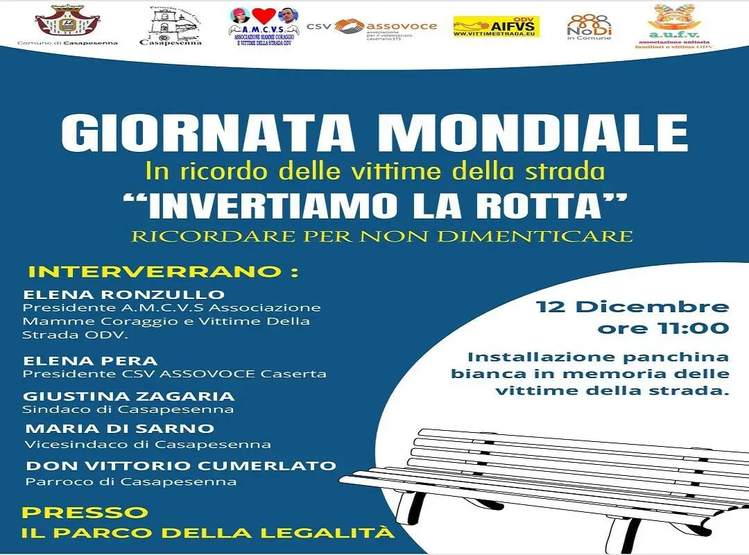 CASAPESENNA - Casapesenna si unisce al ricordo delle vittime della strada con un evento simbolico. Il 12 dicembre, alle ore 11:00, presso il Parco della Legalità a Casapesenna, si terrà una cerimonia in occasione della Giornata Mondiale in ricordo delle vittime della strada.