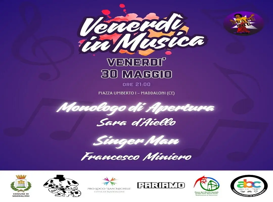MADDALONI - Dopo una breve pausa causata dal maltempo e dalla festa scudetto del Napoli, torna finalmente l’attesissimo appuntamento con Venerdì in Musica, la rassegna che anima, con spettacolo e socialità il centro di Maddaloni.