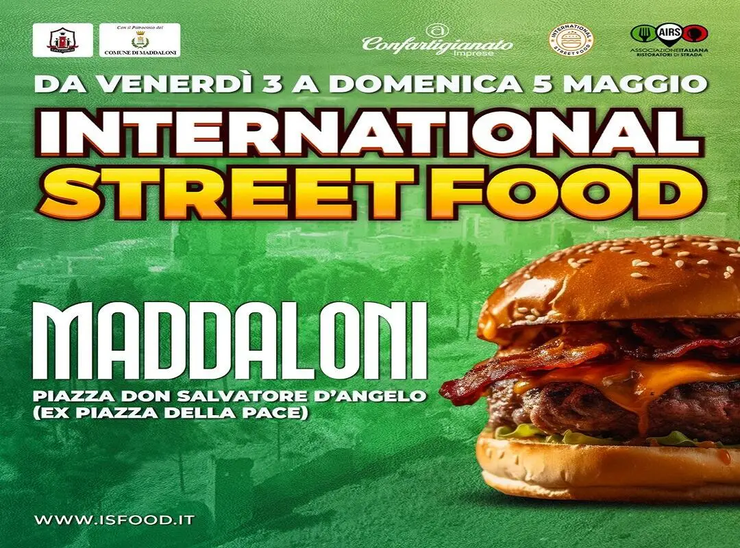 Grazie all'impegno del Presidente dell’ APS Castrum, il dott. Fabio Cembrola che ha fortemente voluto il ritorno a Maddaloni dell'International Street Food, la manifestazione sarà per il quarto anno consecutivo in questa splendida città, nel primo week end di maggio da venerdì 3 a domenica 5 maggio, con la sua 39° tappa che si svolgerà nel Piazzale Don Salvatore d'Angelo - ex piazza della Pace (il venerdì dalle ore 18.00 alle ore 24, il sabato e la domenica dalle ore 12 alle 24).