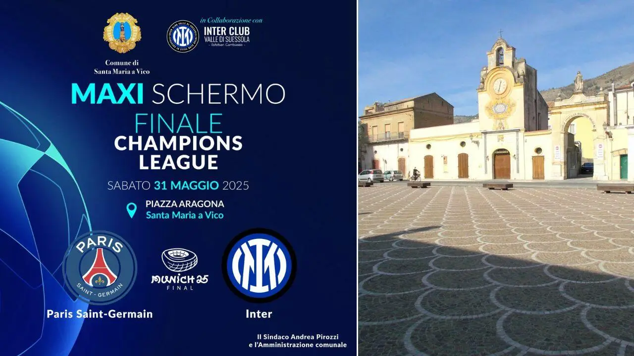 SANTA MARIA A VICO - Una notte nerazzurra nel cuore della Valle di Suessola. In occasione della tanto attesa finale di Champions League, in programma sabato 31 maggio alle ore 21:00, che vedrà l’Inter affrontare il Paris Saint-Germain, l’Amministrazione comunale di Santa Maria a Vico, in sinergia con l’Inter Club Valle di Suessola, organizza una serata speciale all’insegna della passione sportiva e del tifo nerazzurro.