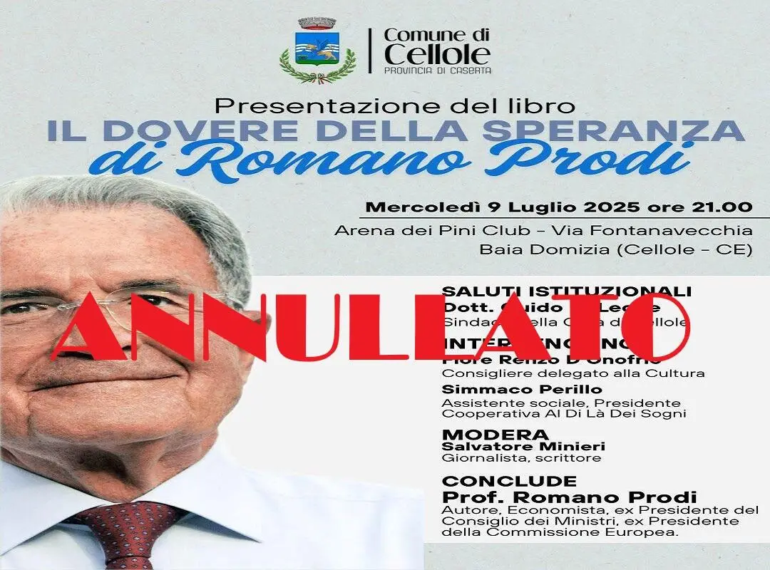 CELLOLE – Annullata la presentazione del libro di Romano Prodi che si sarebbe dovuta svolgere all’Arena dei Pini a Baia Domizia mercoledì 9 luglio.