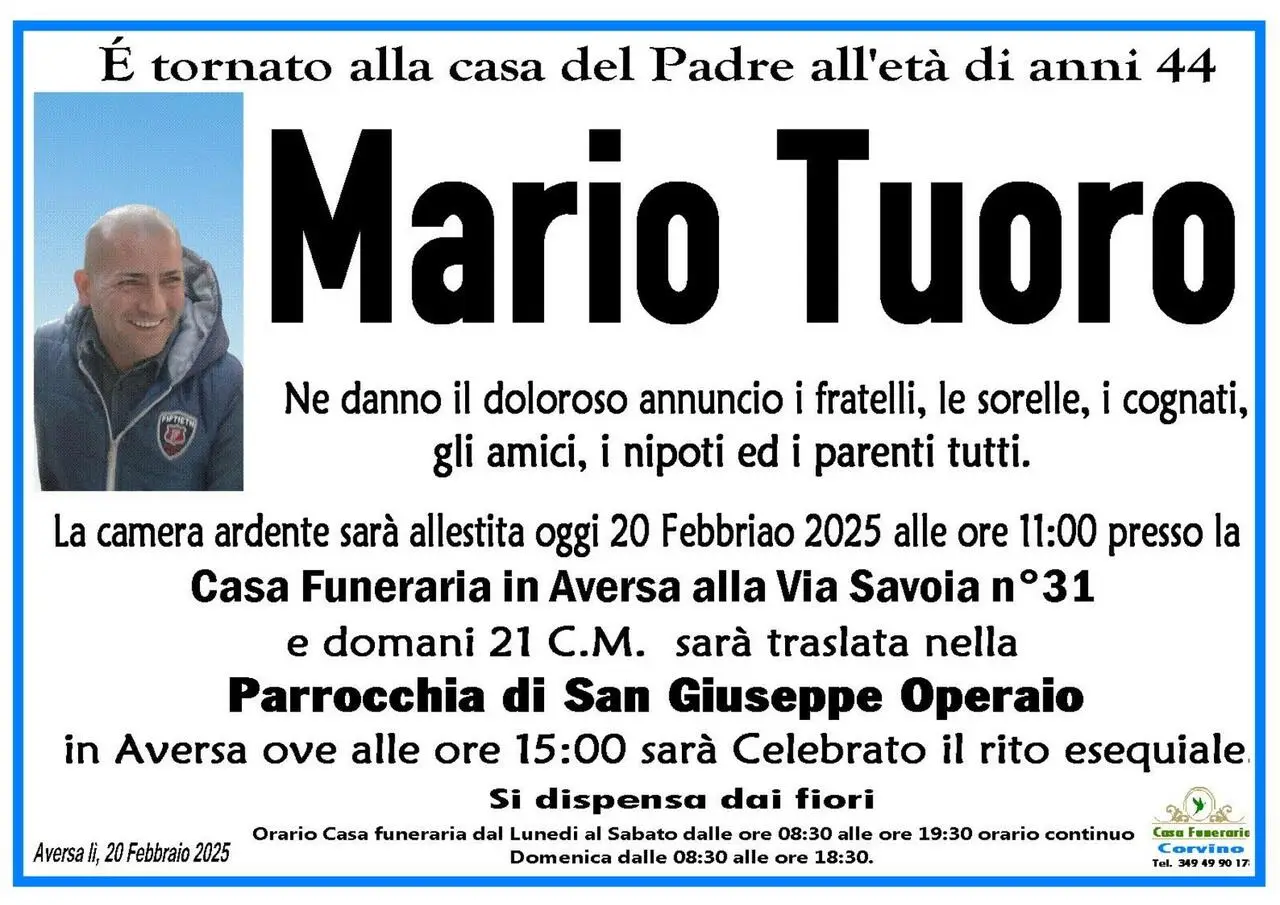 I funerali si svolgeranno domani alle ore 15 nella parrocchia di San Giuseppe Operaio ad Aversa.