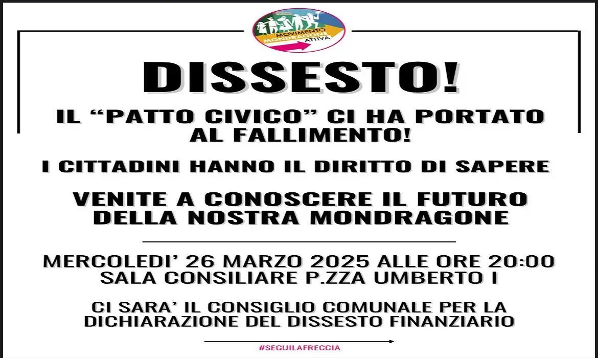 “Il Movimento Mondragone Attiva comunica che, mercoledì 26 marzo alle ore 20:00, presso la Sala Consiliare di Piazza Umberto I, si terrà in seduta pubblica il Consiglio Comunale.