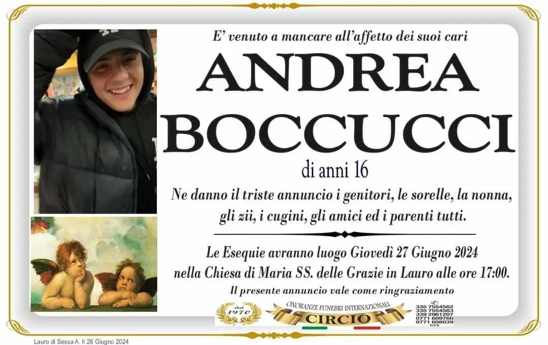 Ragazzo solare e gioioso, Andrea era conosciuto nella comunità della frazione Lauro dove era anche membro del Comitato festeggiamenti. Proprio oggi, giovedì 27 giugno, si svolgeranno i funerali. L’ultimo saluto al 16enne si terrà alle ore 17:00 nella chiesa di Maria SS. delle Grazie nella frazione Lauro.