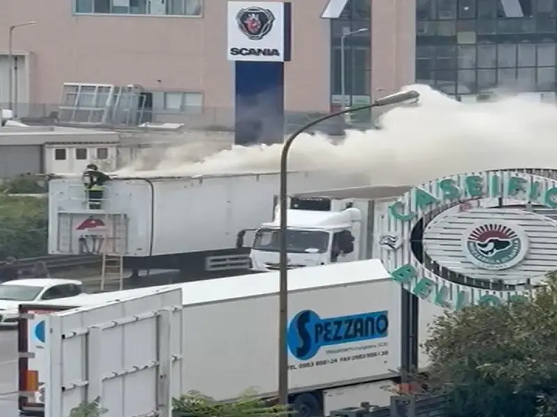 Un rimorchio di un camion è stato colpito da un incendio. In poco tempo una nube di fumo si è alzata in cielo attirando l’attenzione degli automobilisti e dei clienti del caseificio Bellopede lì vicino.