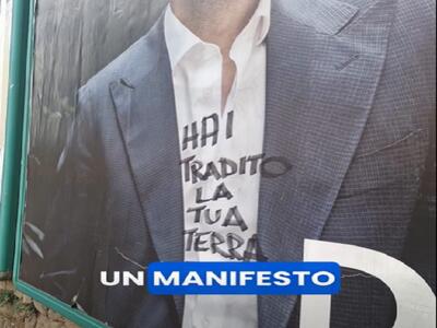 "Hai tradito la tua terra", scritta nera sul manifesto di Maurizio Del Rosso