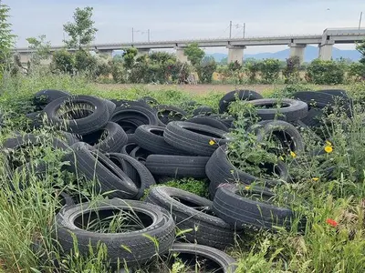 Cumulo di pneumatici scoperti sotto il ponte della ferrovia