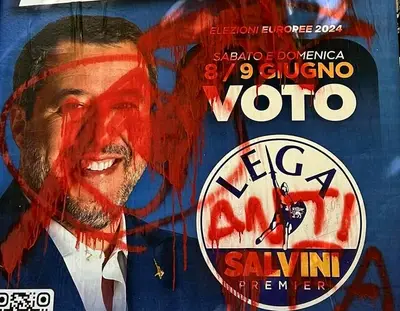Manifesti della Lega con Salvini imbrattati con vernice rossa e scritta Antifa